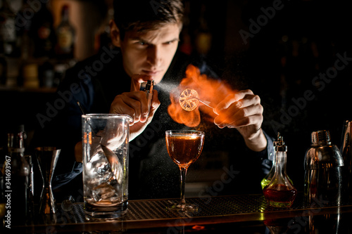 Young bartender holds tweezers with slice of citrus over glass sprinkles and sets it on fire.