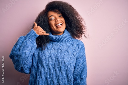Young beautiful african american woman with afro hair wearing winter sweater over pink background smiling doing phone gesture with hand and fingers like talking on the telephone. Communicating