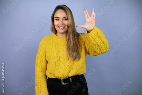 Young beautiful blonde woman with long hair wearing a yellow sweater doing star trek freak symbol