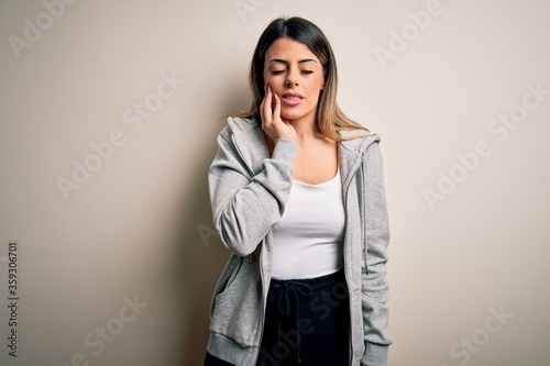 Young beautiful brunette sportswoman wearing sportswoman training over white background touching mouth with hand with painful expression because of toothache or dental illness on teeth. Dentist