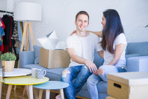 Young beautiful couple sitting on the sofa drinking coffee at new home around cardboard boxes