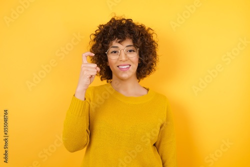 Young beautiful Cucasian businesswoman wearing yellow sweater and glasses standing against yellow background pointing up with fingers number nine in Chinese sign language Jiu