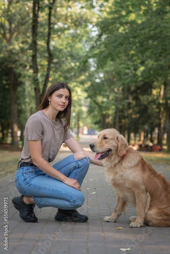 Young beautiful dark-haired girl in a summer park with a golden retriever.