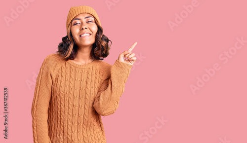 Young beautiful mixed race woman wearing wool sweater and winter hat with a big smile on face, pointing with hand finger to the side looking at the camera.