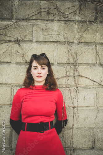 young beautiful red dressed vintage hipster woman