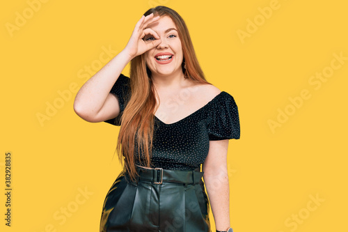 Young beautiful redhead woman wearing elegant clothes doing ok gesture with hand smiling, eye looking through fingers with happy face.