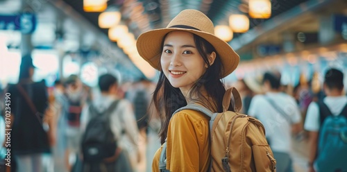 Young beautiful smiling woman wearing trendy outfit, straw hat, travel with backpack.
