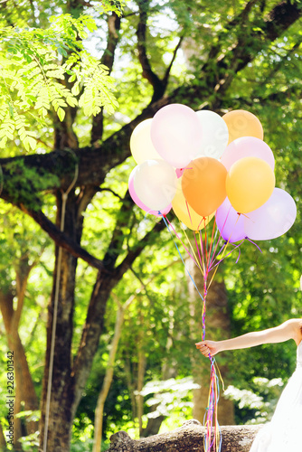 Young beautiful woman holding colorful air balloons in the park. Relaxation on international women 's day