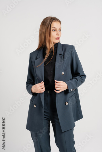 Young beautiful woman posing in a business suit. Employee and business concept.