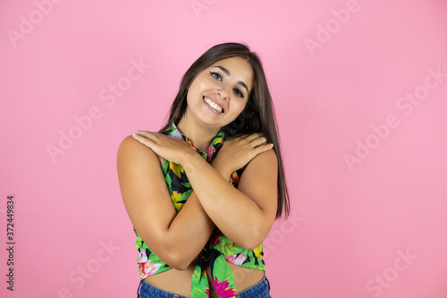 Young beautiful woman standing over isolated pink background hugging oneself happy and positive, smiling confident