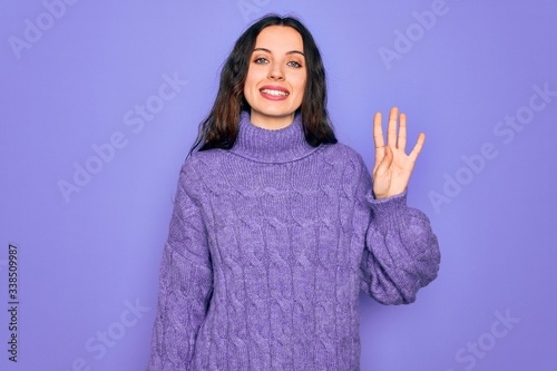 Young beautiful woman wearing casual turtleneck sweater standing over purple background showing and pointing up with fingers number four while smiling confident and happy.