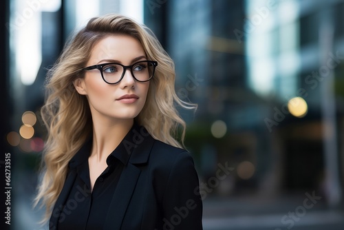 Young beautiful woman wearing eyeglasses looking side in the city.