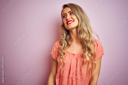 Young beautiful woman wearing t-shirt standing over pink isolated background looking away to side with smile on face, natural expression. Laughing confident.