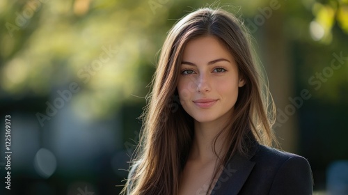 Young Beautiful Woman with Long Brown Hair in Outdoor Portrait Surrounded by Lush Greenery and Soft Natural Light in a Park Setting
