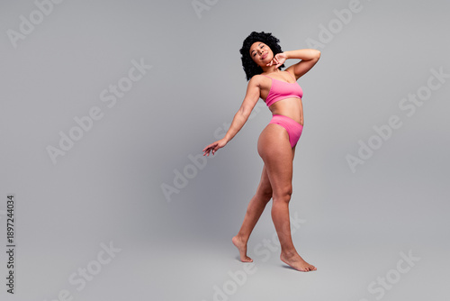 Young beauty model in pink bikini posing with confidence to showcase body positivity fitness and fashion lifestyle