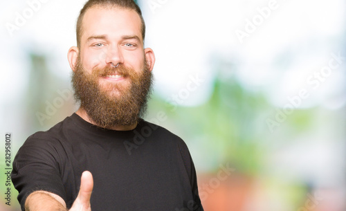 Young blond man wearing casual t-shirt smiling friendly offering handshake as greeting and welcoming. Successful business.