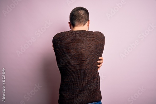 Young blond man with beard and blue eyes wearing casual sweater over pink background Hugging oneself happy and positive from backwards. Self love and self care