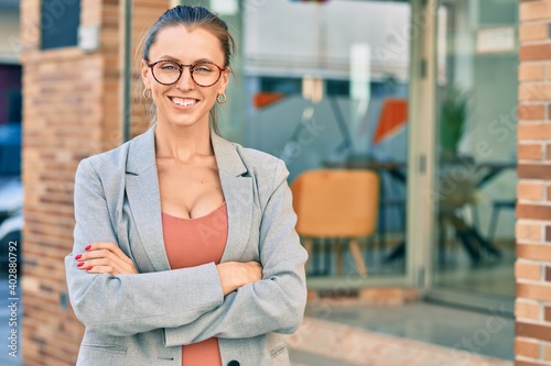 Young blonde businesswoman with arms crossed and smiling happy at the city.