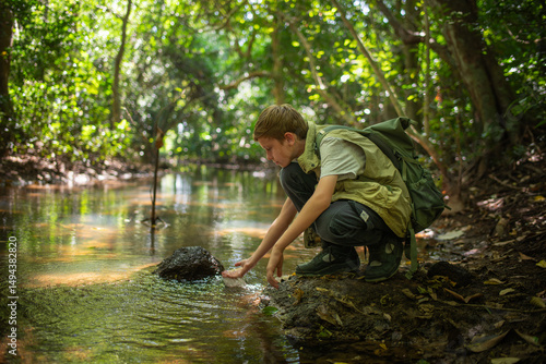 Young boy crouches at the edge forest stream connection between a learning from the environment holiday ecotourism concept.