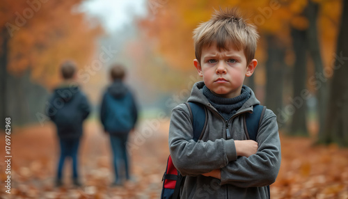 Young boy looks sad and angry with arms crossed. Two boys walk away in background on autumn path. Childhood problem, school exclusion, or social isolation.