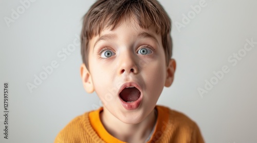 Young boy making surprised facial expression.