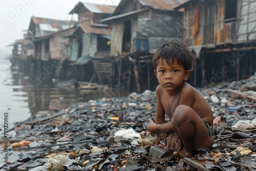 Young boy sitting barefoot amid a polluted shoreline with trash, depicting environmental and social issues