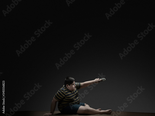 Young boy sitting on the floor and changing the channel with difficulty. (Obesity)