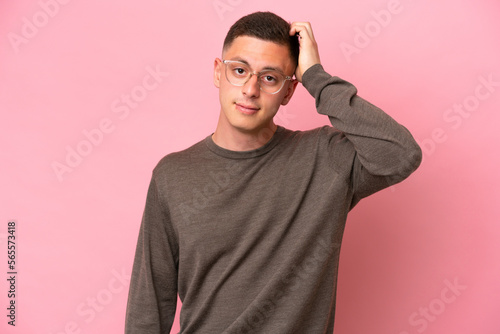 Young Brazilian man isolated on pink background with an expression of frustration and not understanding