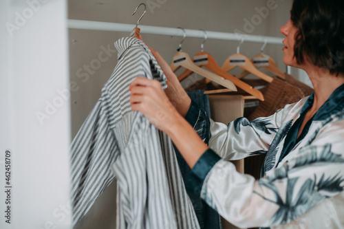 Young brunette girl with short hair in pajamas at home hangs clothes on a rail on hangers