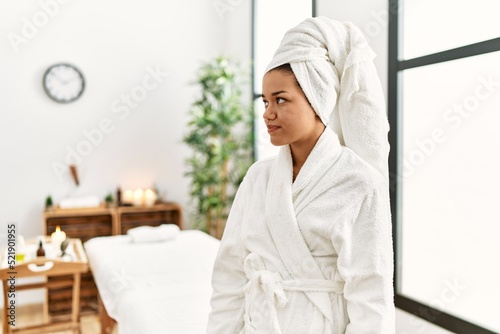Young brunette woman wearing towel and bathrobe standing at beauty center looking to side, relax profile pose with natural face with confident smile.
