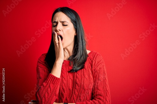 Young brunette woman with blue eyes wearing casual sweater over isolated red background bored yawning tired covering mouth with hand. Restless and sleepiness.