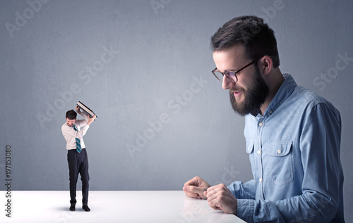 Young businessman fighting with miniature businessman