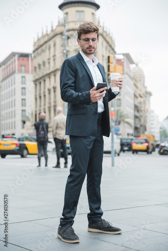 Young businessman holding coffee cup standing on street looking at mobile phone