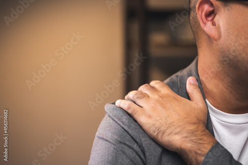 Young businessman works late at night in a dimly lit room. He tired and stressed needs rest. He has shoulder neck and back pain. Working hard and overtime too much going to symptom office syndrome.