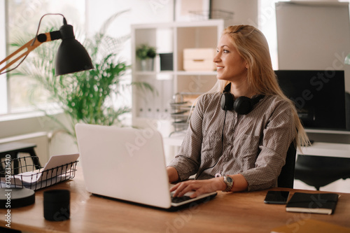 Young businesswoman in office. Beautiful woman with headphones.