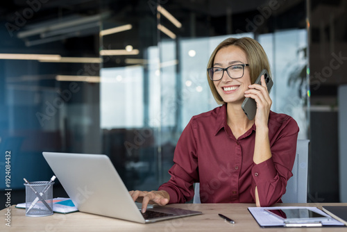 Young businesswoman smiling while talking on her smartphone and typing on a laptop at a modern office desk, confidently multitasking and staying productive during remote work