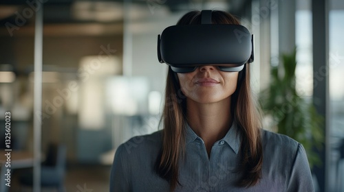 Young caucasian female experiencing virtual reality with vr headset in modern office