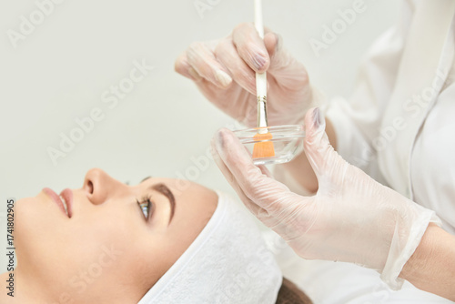 Young caucasian female receiving facial treatment by professional aesthetician with brush and skincare products.