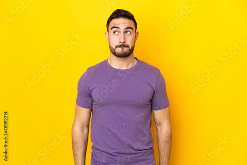 Young caucasian handsome man isolated on yellow background having doubts while looking up