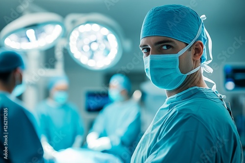 Young caucasian male surgeon in operating room with medical team in background