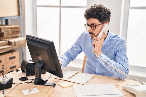 Young caucasian man ecommerce business worker talking on telephone using computer at office