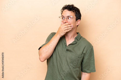 Young caucasian man isolated on beige background doing surprise gesture while looking to the side