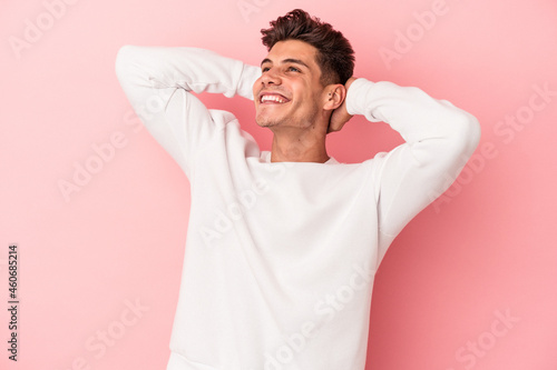 Young caucasian man isolated on pink background feeling confident, with hands behind the head.