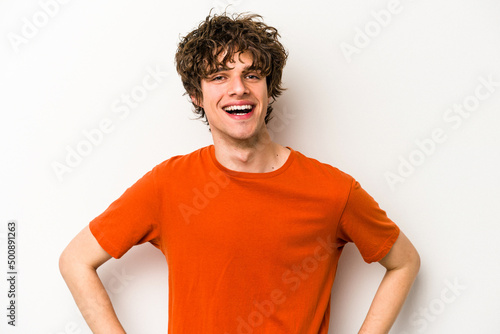 Young caucasian man isolated on white background confident keeping hands on hips.