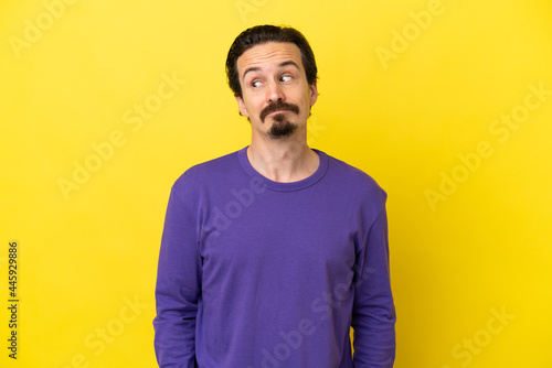 Young caucasian man isolated on yellow background making doubts gesture looking side