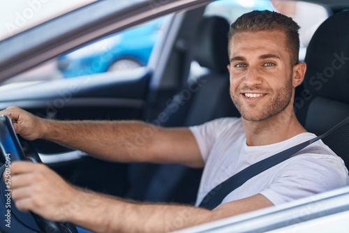 Young caucasian man smiling confident driving car at street