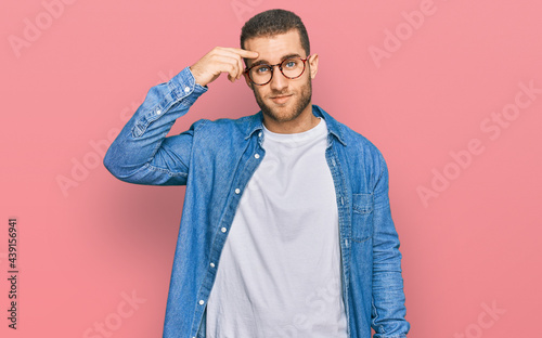 Young caucasian man wearing casual clothes pointing unhappy to pimple on forehead, ugly infection of blackhead. acne and skin problem