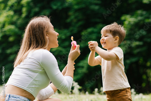 Young Caucasian mother and her happy little son are having fun playing with soap bubbles in the park