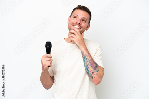 Young caucasian singer man picking up a microphone isolated on white background looking up while smiling