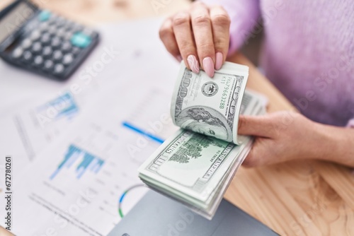 Young caucasian woman ecommerce business worker holding dollars accounting at office